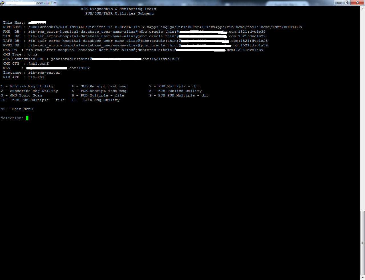 There are multiple configurations possible with the fully distributed J2EE RIB. This utility is used to manage the configuration files that allow the rdmt tools to access them. This option can also be used to switch/re-configure the previously configured WLS/JMX configuration. |