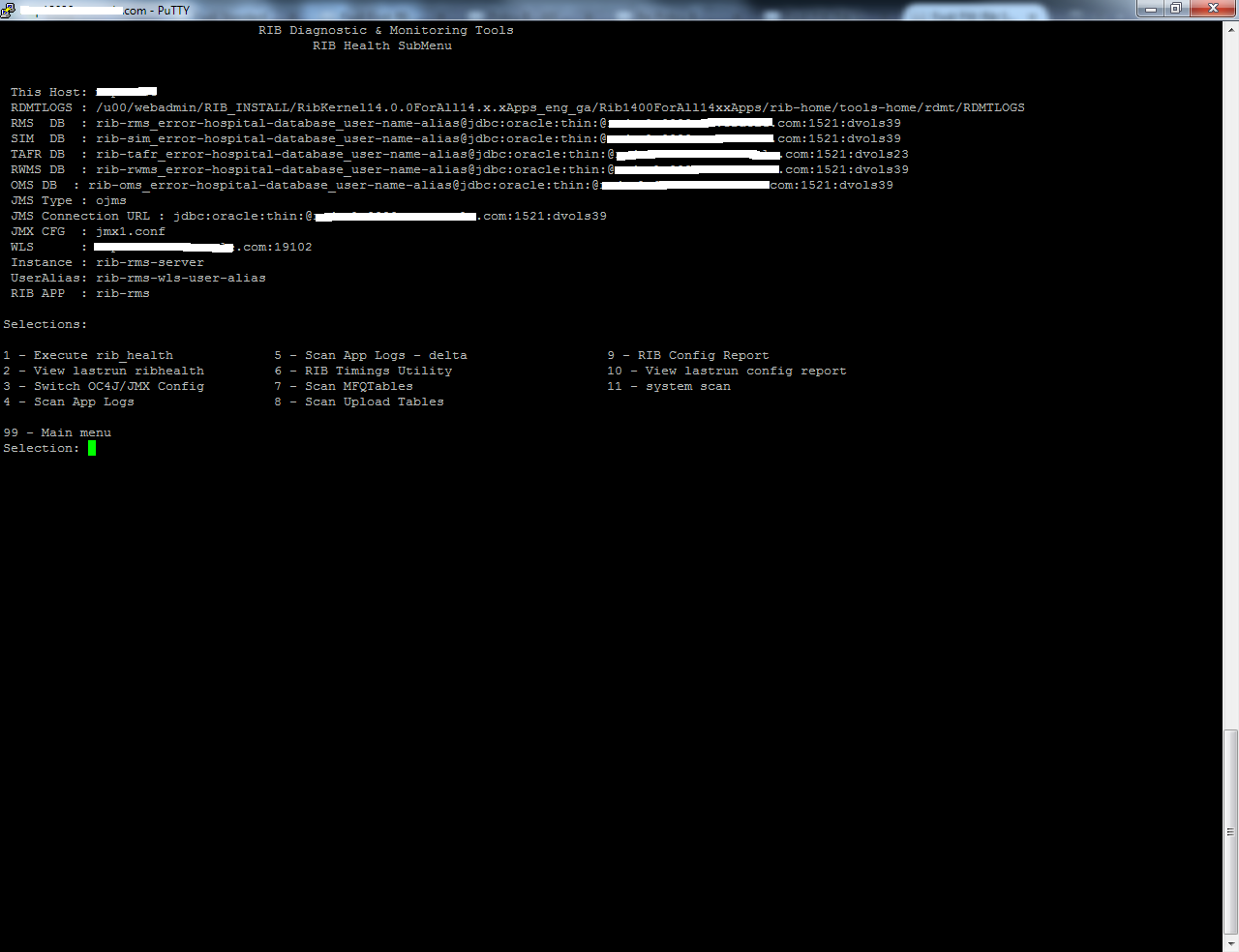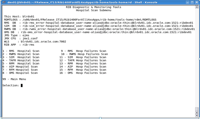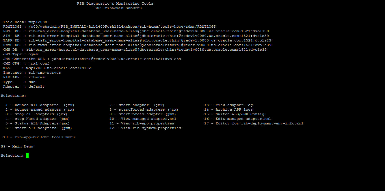 After the RIB has been installed and configured on WLS, the user can verify installations and configurations using RDMT. A script is linked in the RDMT menu that scans the installations and configurations of rib applications deployed using the configuration settings in the RDMT configuration files.