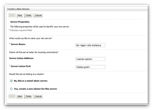 Use the following steps to create a new managed server instance for rib-<app> and configure it to RIB requirement.
