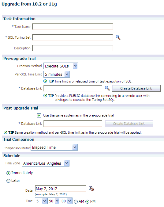 SQLパフォーマンス・アナライザを実行し、Oracle Enterprise ManagerまたはAPIを使用し、Oracle Database 10g リリース2以上のリリースからのデータベースのアップグレードをテストすることができます。詳細は、次の項を参照してください。
