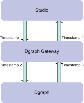問合せがStudioからDgraphに、およびDgraphからStudioに移動すると、ログの4つの計算済タイムスタンプによって問合せの時点が記録されます。次の図に、問合せパスを示します。