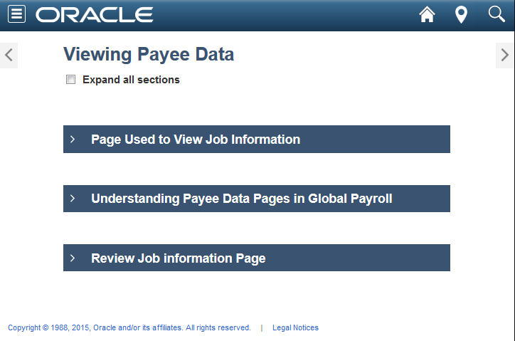 This example illustrates a typical help page. The Previous and Next buttons appear on either side of the page heading, “Viewing Payee Data.” The Expand all sections check box appears below the heading (although some pages might include text between the heading and check box). This page contains three collapsed sections.