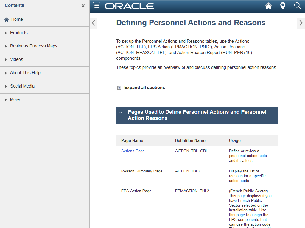 Access links to related sites, such as My Oracle Support. Note: If your organization uses a locally installed help site, your help administrator may also include links that are specific to your organization in this section. See Making External Documentation Available Through the PeopleSoft Online Help. |
