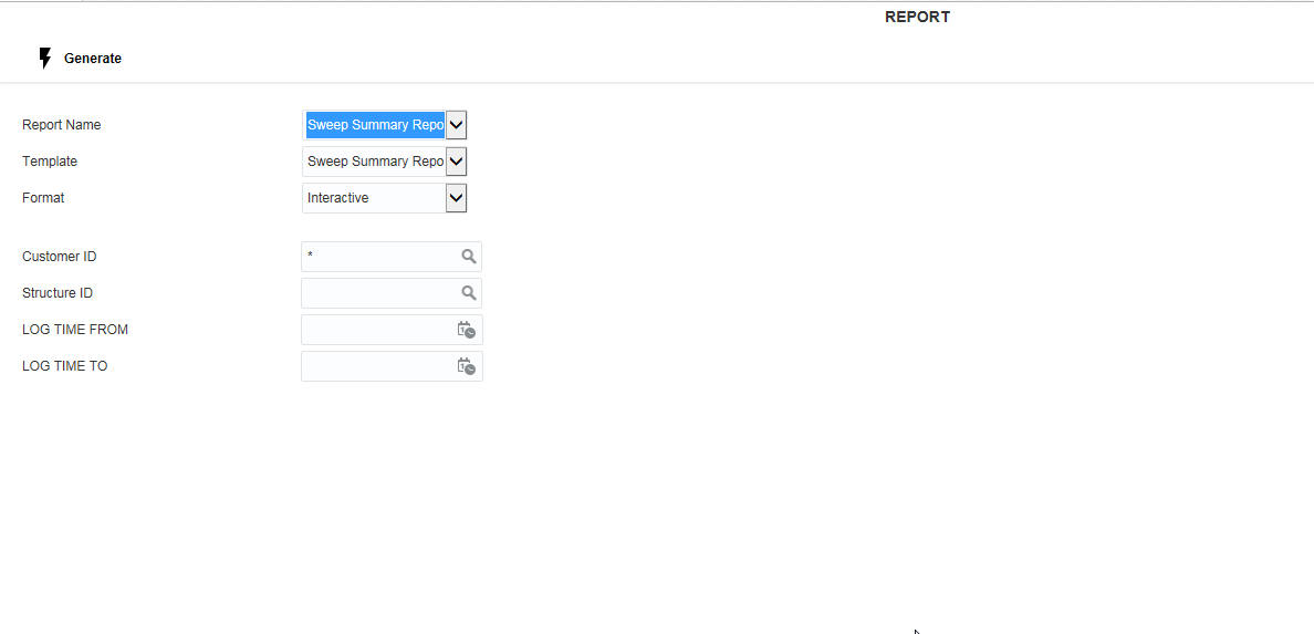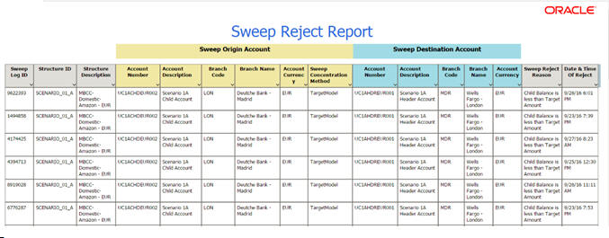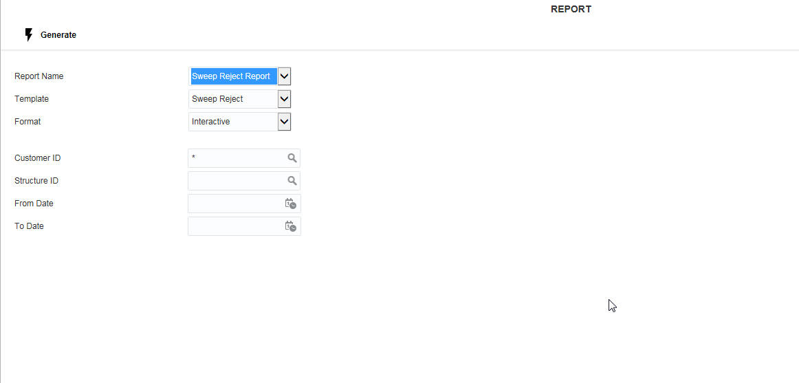 This report provides details of Sweeps rejected along with reason for rejection as a Daily report. Invoke the Report screen and select the report name as Sweep Reject Report.