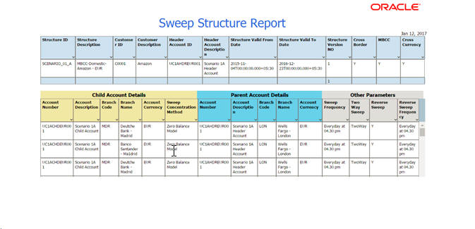 This report provides details on all the Sweep structures maintained with details of the sweep agreements between the participant accounts. You can view it as Daily report and Range report. Invoke the Report screen and select the report name as Sweep Structure Report.