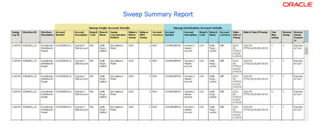 This report provides the summary of sweeps done on a specified date\ specific period for a customer or a structure. It states the sweep reference number, sweep amount, the accounts involved, reference number and the value date. Invoke the Report screen and select the report name as Sweep Summary Report.