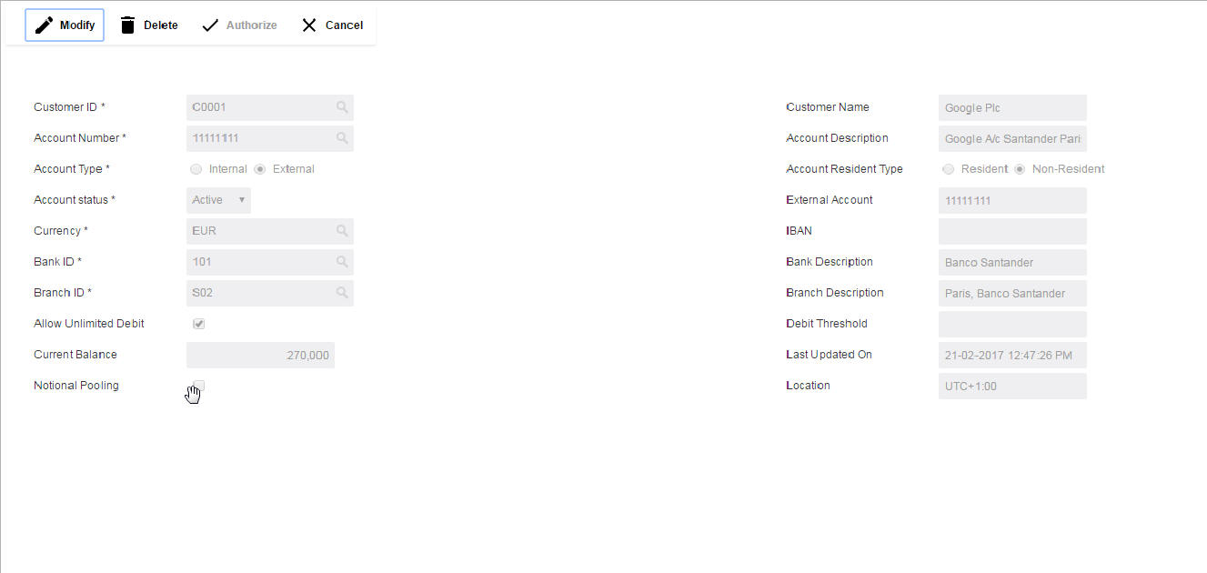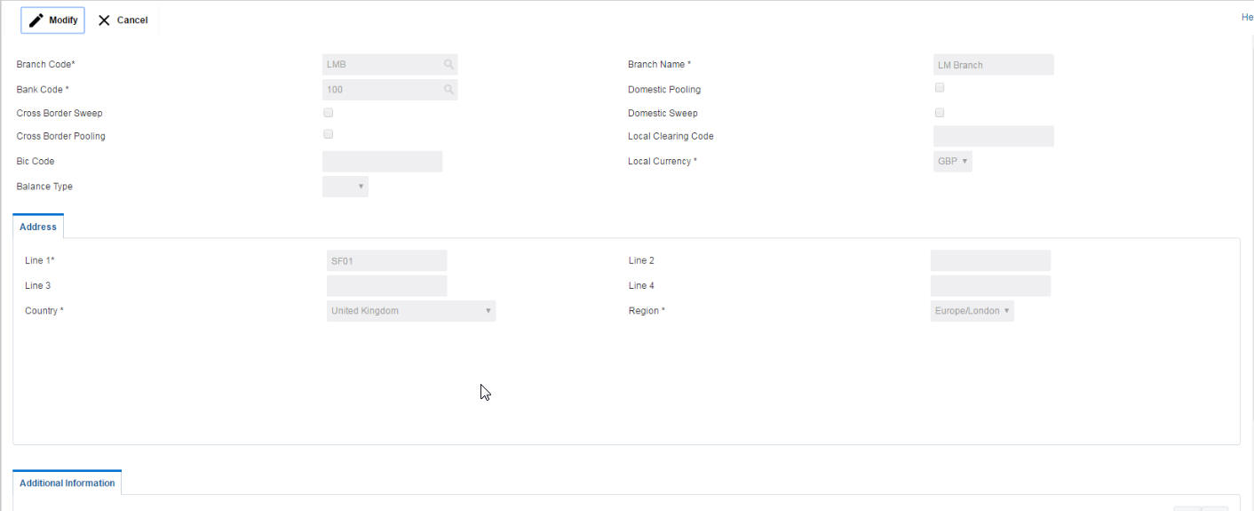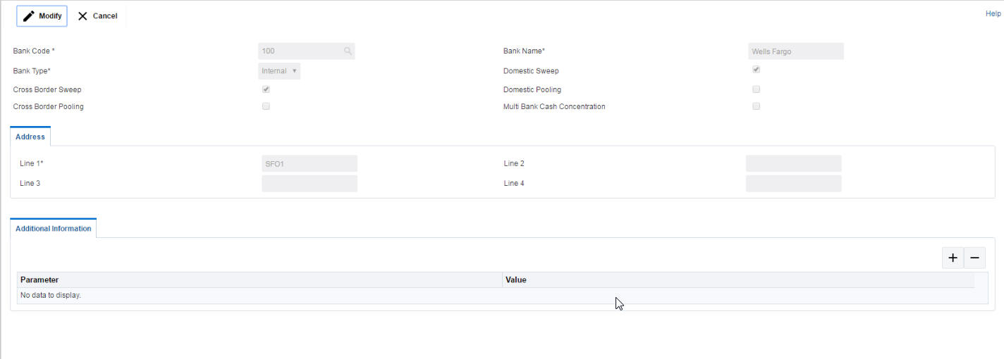 Bank setup maintenance captures details of the banks participating in Liquidity Management. This set up is done both for the Host bank and the External banks.Click on Bank Setup link in the System Setup page to open the Bank Maintenance page.