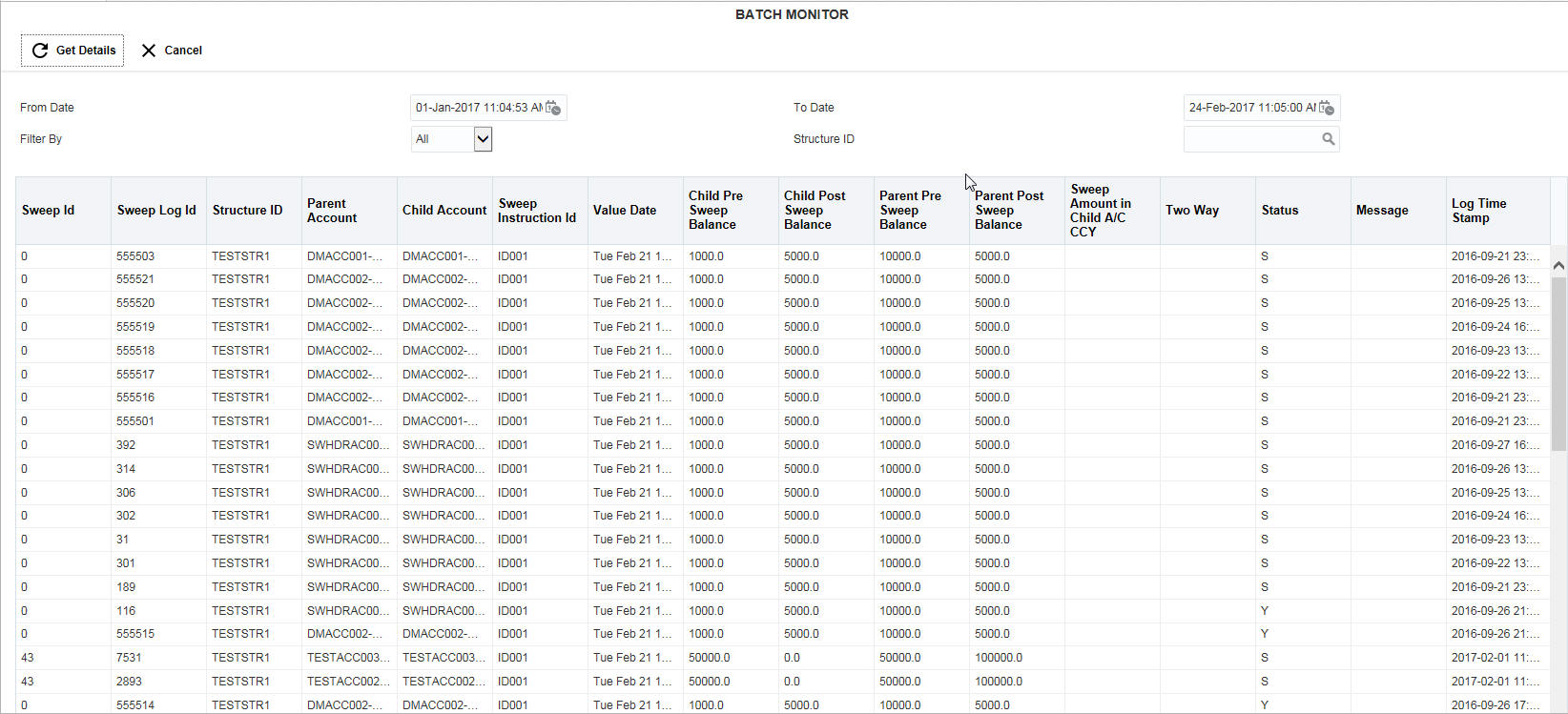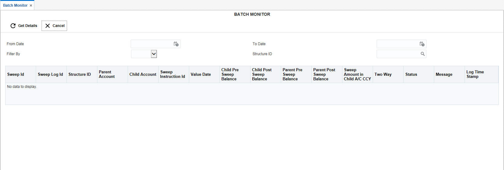 This option enables you to view the back value dated transactions executed. To invoke this screen, click ‘Batch’ tab on the application and select ‘Sweep Monitor’.