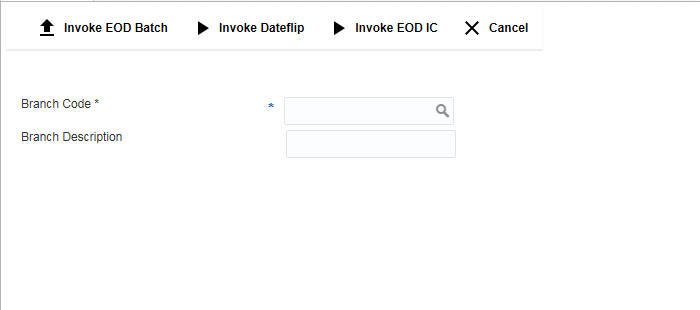 Specify the branch for which the EOD is to be initiated. You can also select the branch code from the option list.The list displays all the branch codes maintained in the system.