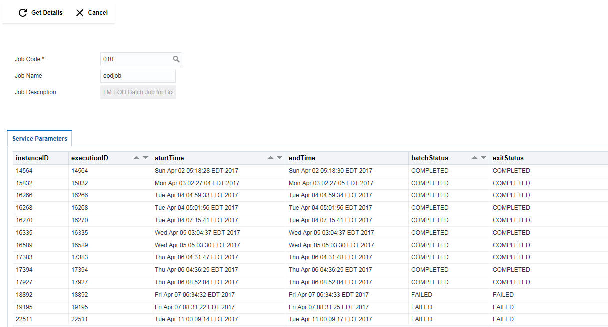 Using this option you can view the status of various jobs executed in the LM system.To invoke this screen, click ‘Batch’ tab on the application and select ‘Job Scheduler.’.