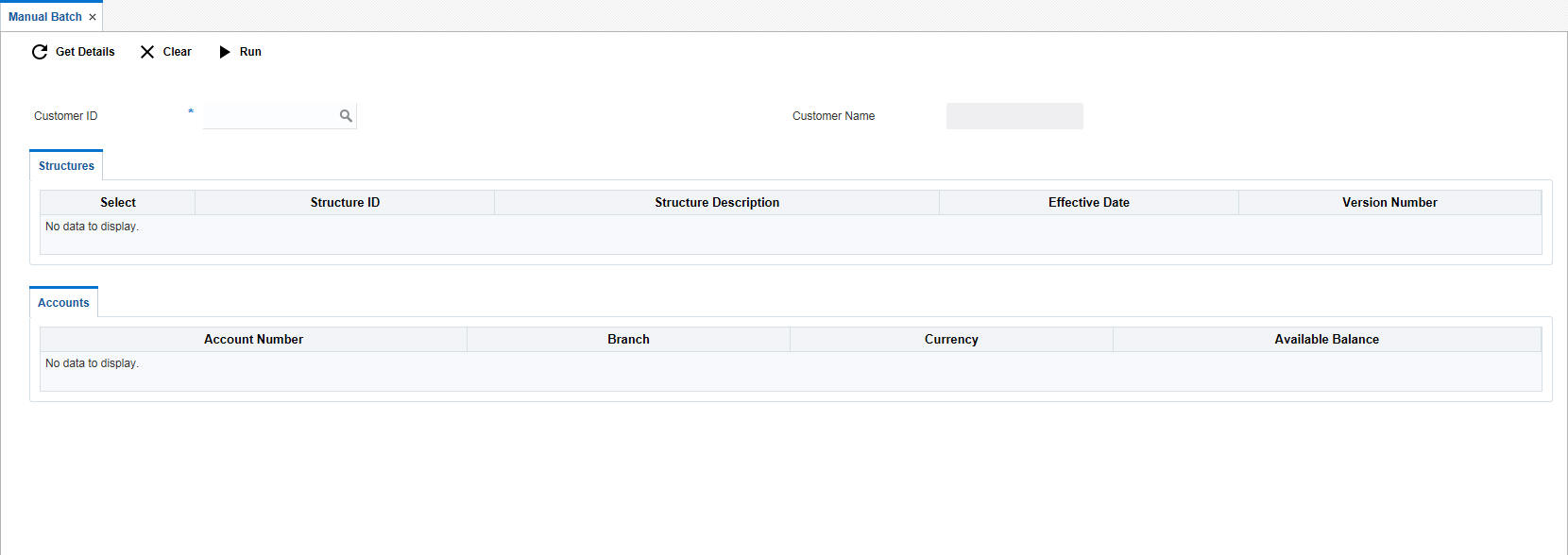 Specify the customer ID for which manual batches are to be run.You can select the customer ID from the option list. The list displays all the customer IDs maintained in the system