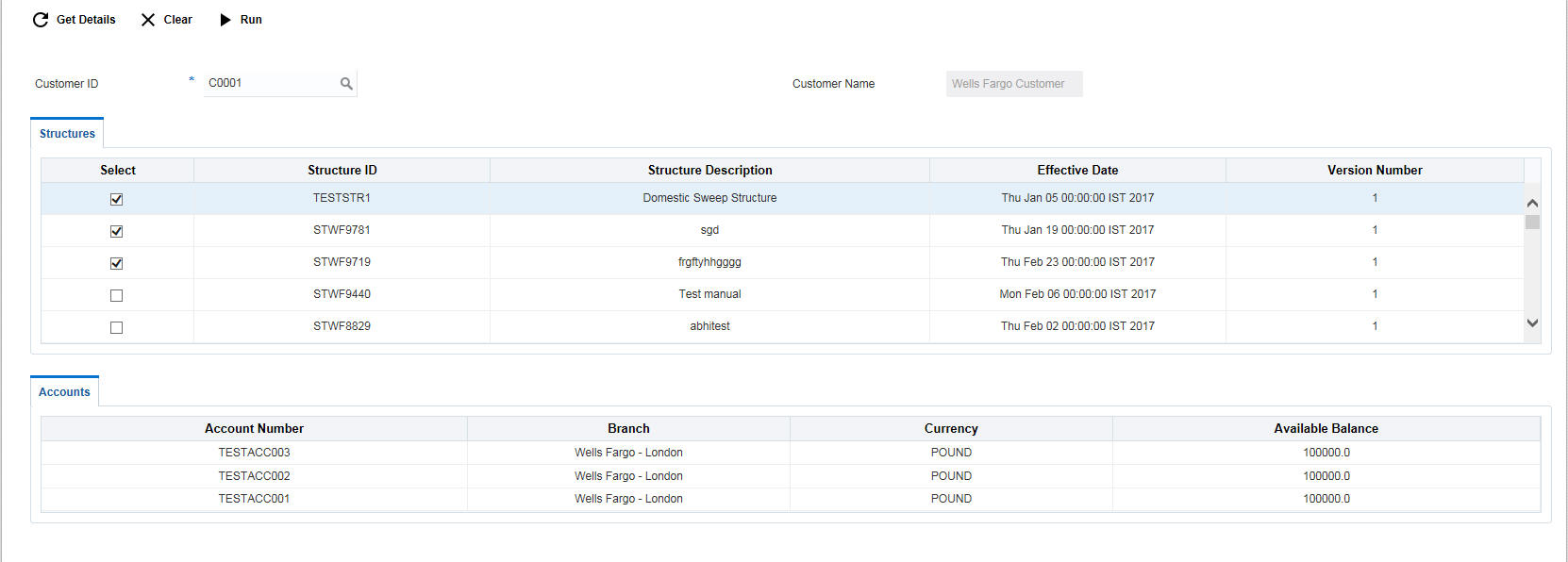 Click ‘Get Details’ button to view the structures linked to the customer ID and accounts linked to each structure.