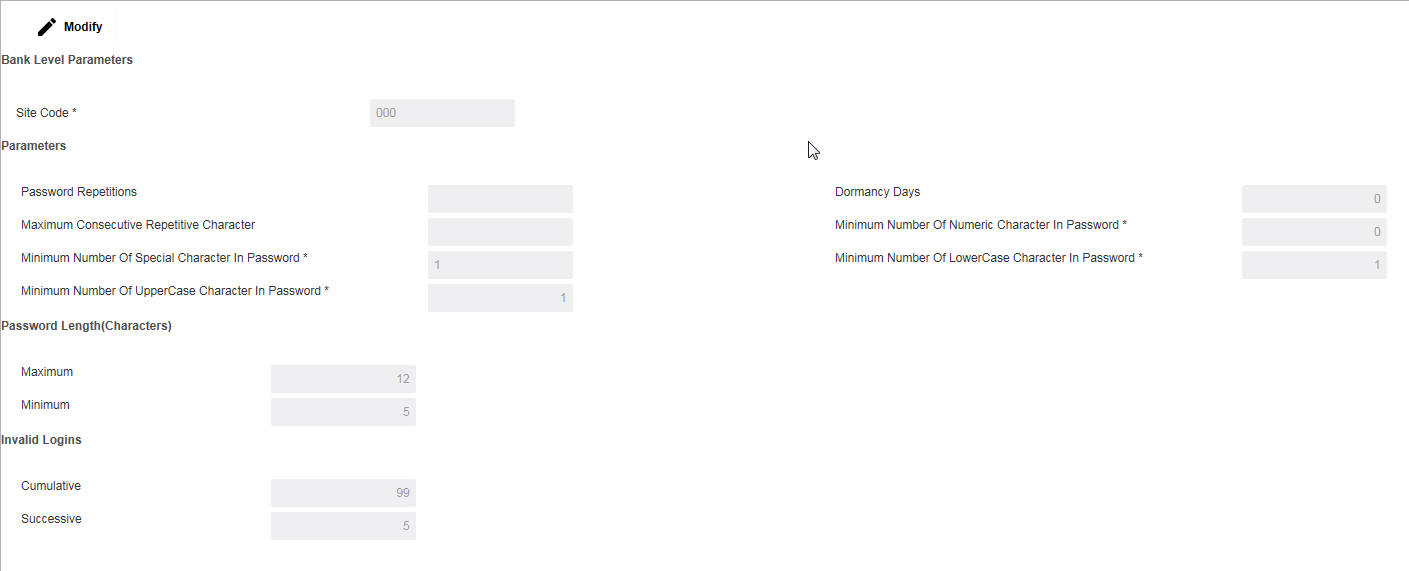 Click Modify button to set the password policy for the system. You can specify the following details here: