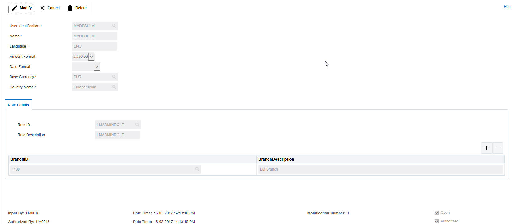 You can map the role to the selected user and select the branches for which this mapping is active using this option. You can indicate the branches from where the user can operate. You can specify the following details here: