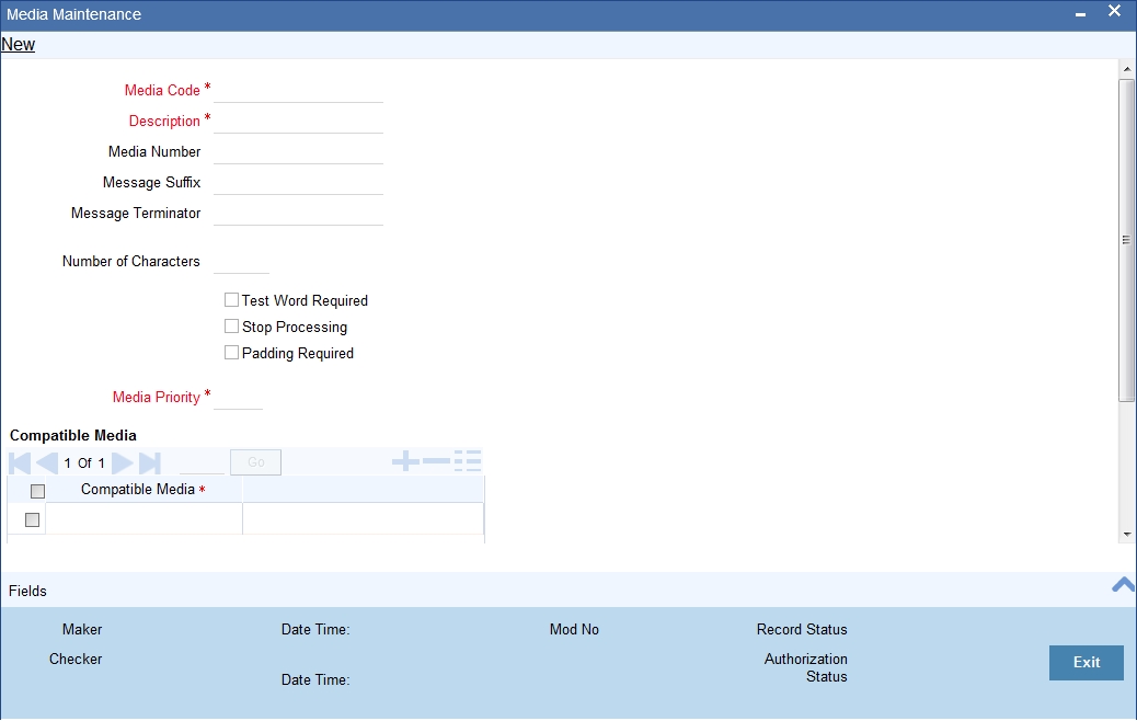 After you have made mandatory entries, save the record. A media maintenance record that you have created should be authorized by a user, bearing a different Login ID, before the End of Day processes are triggered. Click ‘Exit’ or ‘Cancel’ button to return to the application.
