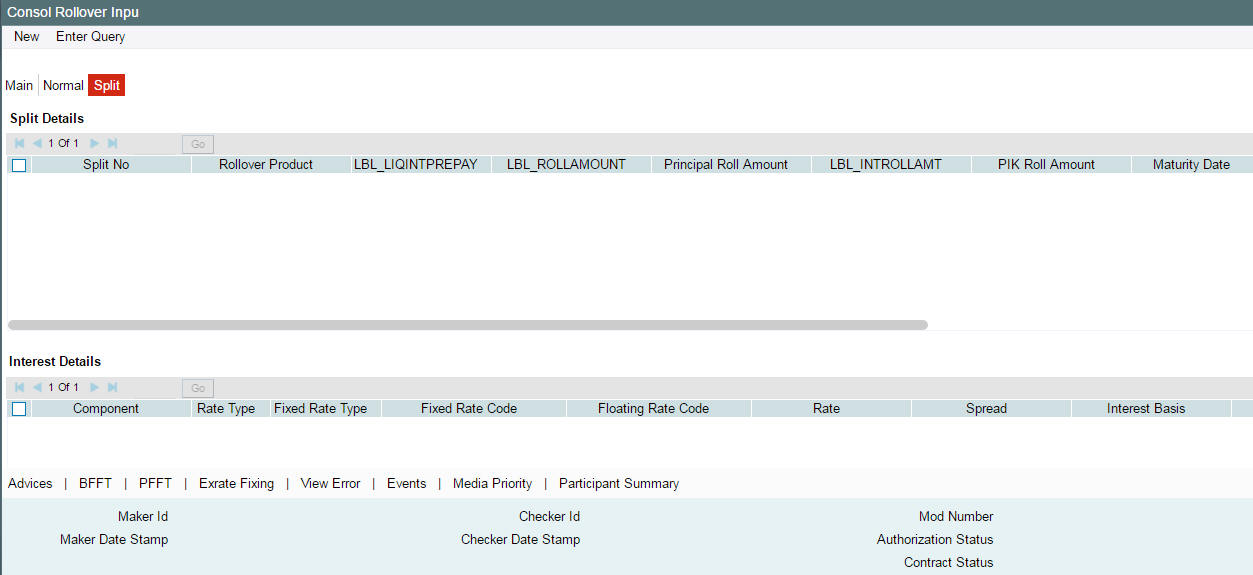 Oracle FLEXCUBE allows you to perform a Principal + Interest type of rollover for all Normal, Split, Consolidation and Consol + Split methods of rollover. For this, you have to select the Rollover Amount as ‘Principal + Interest’ in the following screens, depending on the type of rollover you wish to initiate: