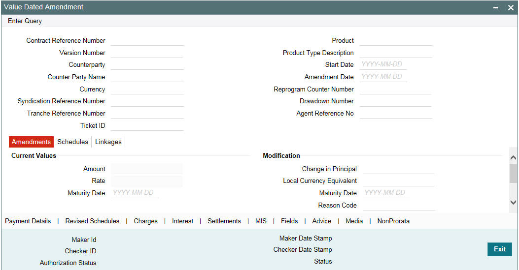 By default, the current system date is displayed as the date of amendment. Once you specify this date, you cannot change it.