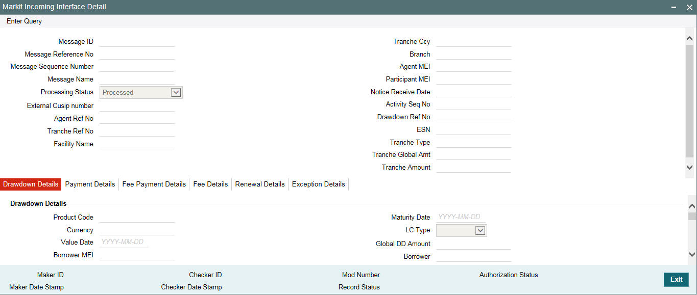 To generate FpML messages to Markit, you are required to maintain all the messages that you wish to generate in the ‘Message Type Maintenance’ screen and in the borrower products (tranche/drawdown), you can associate the messages to the events for which the messages should be generated. The messages to Markit are generated when the contract to which the message is attached is saved and it is handed off during authorization of these contracts.