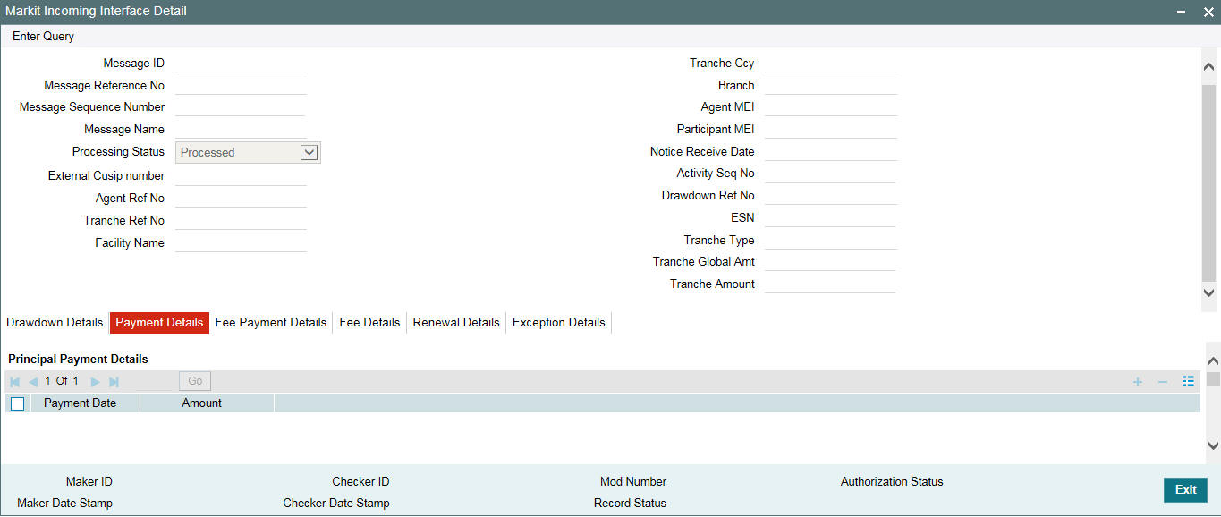Incoming messages with Message Name as ‘Repayment Notice’ is placed in the Incoming Browser with Processing Status as ‘Pending’. You can view and process it by clicking ‘Details‘ button against the message. The ‘Interest & Principal Payment Details’ screen is displayed as shown below: