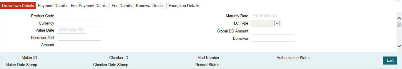Incoming messages with Message Name as ‘LC Issuance Notice’ is placed in the Incoming Browser with Processing Status as ‘Pending’. You can view and process it by clicking ‘Details‘ button against the message. The ‘Drawdown Details’ tab is displayed as shown below: