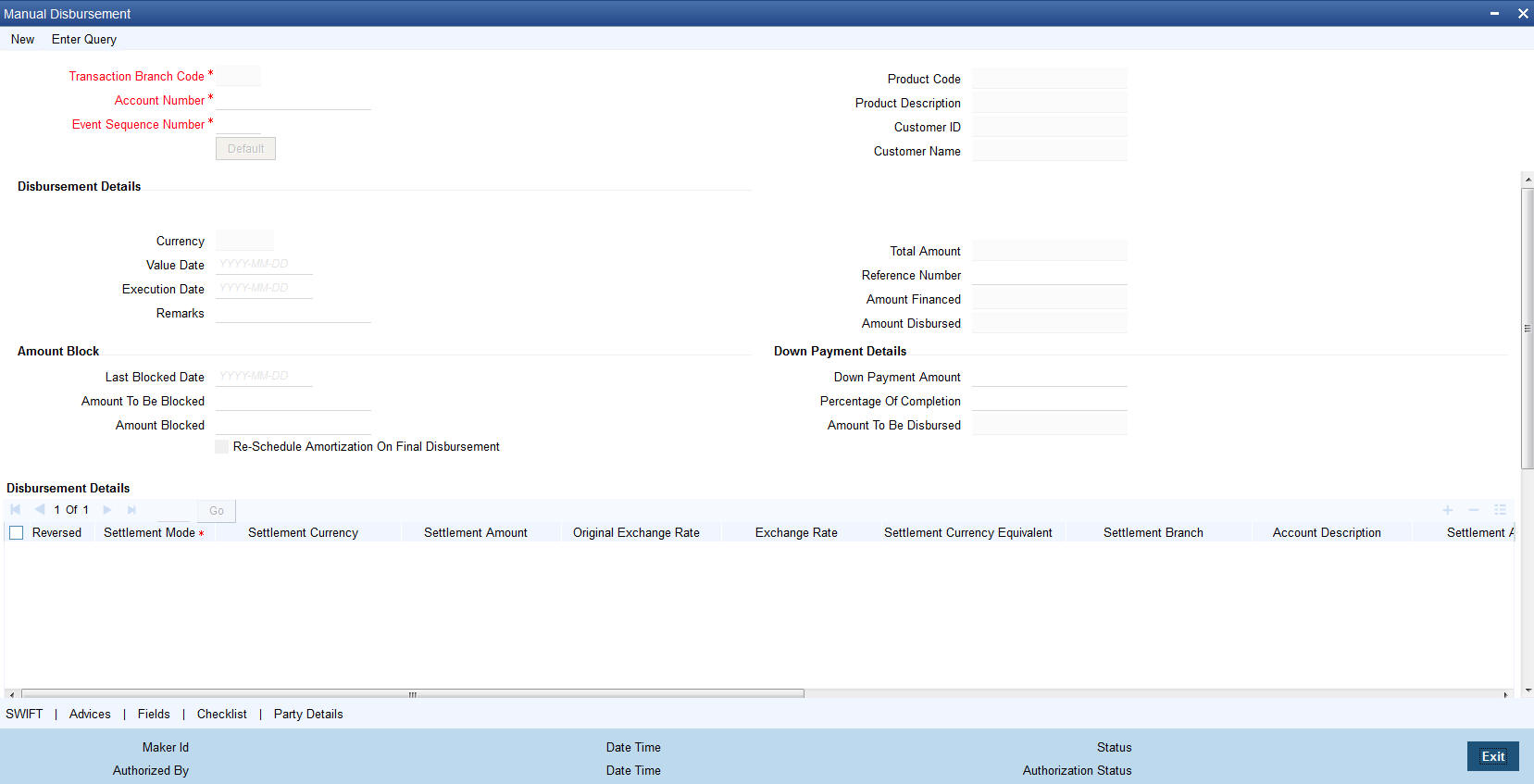 To begin the disbursement, click on the ‘New’ icon in the toolbar of the screen. Enter the account number and click the ‘Default’ button. The system defaults the details based on product definition and the account maintained by the bank for the account. You can modify the relevant details.
