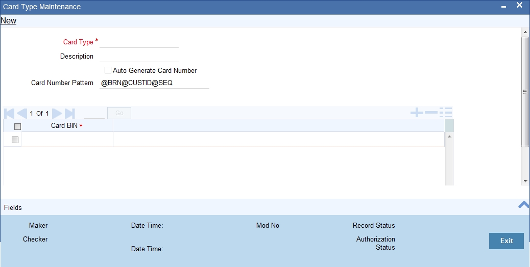 You can maintain the card type in the 'Card Type Maintenance' screen. You can invoke the 'Card Type Maintenance' screen by typing 'STDTYMNT' in the field at the top right corner of the Application tool bar and clicking the adjoining arrow button.