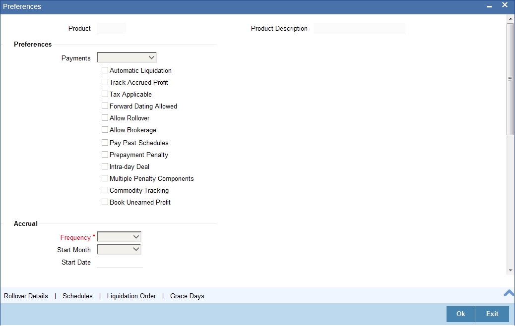 The product definition facility is a one-time effort. When defining a Murabaha money market deal type or scheme as a product, you can specify (amongst other details):