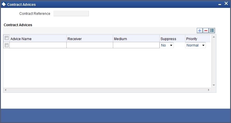 Click ‘Advices’ button in the SI Input Detailed screen. The ‘Contract Advices’ screen will be displayed.