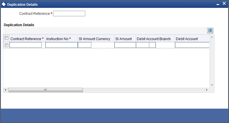 You can view all the duplicate instructions in the ‘Duplication Details’ screen. Click ‘Duplication Details’ button in the ‘Standing Instruction Online Detailed’ screen to invoke this screen.
