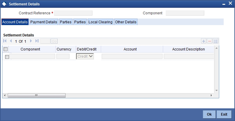 Besides the account details, the other details that are available include the currency in which the component is expressed, its Account Branch, Account Number, Account Description, Account Currency, Debit/Credit, Original Exchange Rate (in the case of the component currency being different from the account currency), Rate Code (Mid/ buy/sell), Spread Definition, Customer Spread, Euro in Currency, Euro in Amount, Generate Message, Netting Indicator, IBAN Account Number, Negotiated Cost Rate, Negotiation Reference.