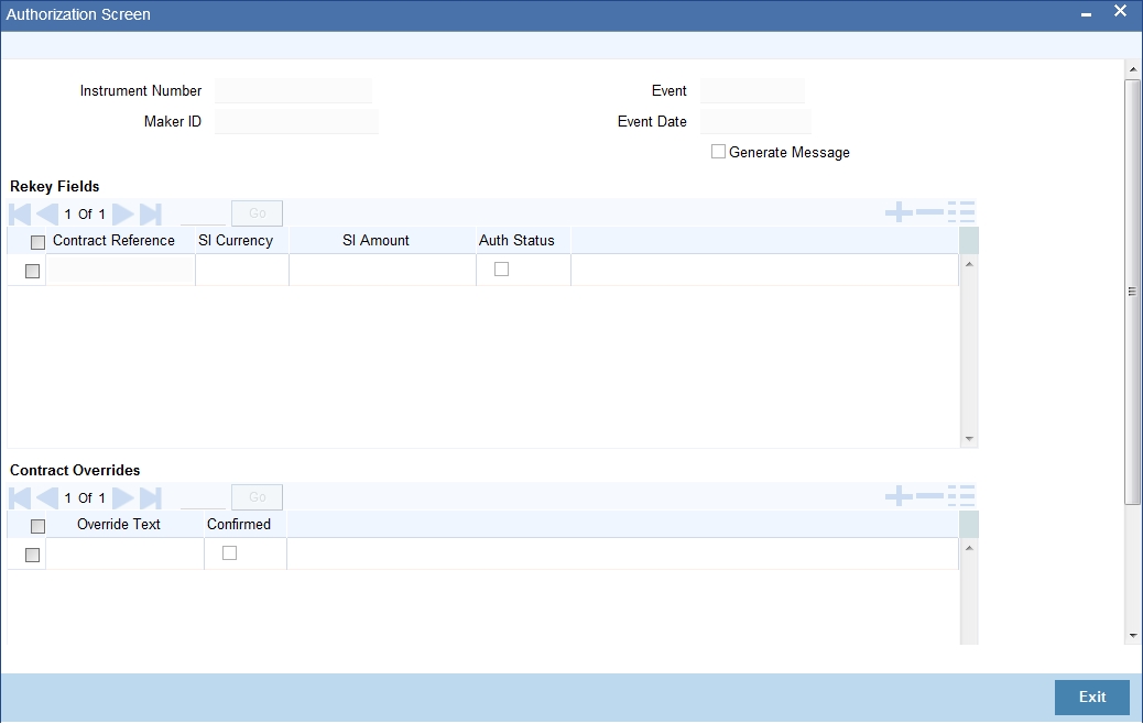 If you have enabled rekey fields, you need to enter the rekey details (rekey currency and rekey amount). The system validates these values against the original values entered by the maker of the contract. If the details match, the system authorizes the instruction. If the details do not match, an appropriate message will be displayed and the instruction will not be authorized.
