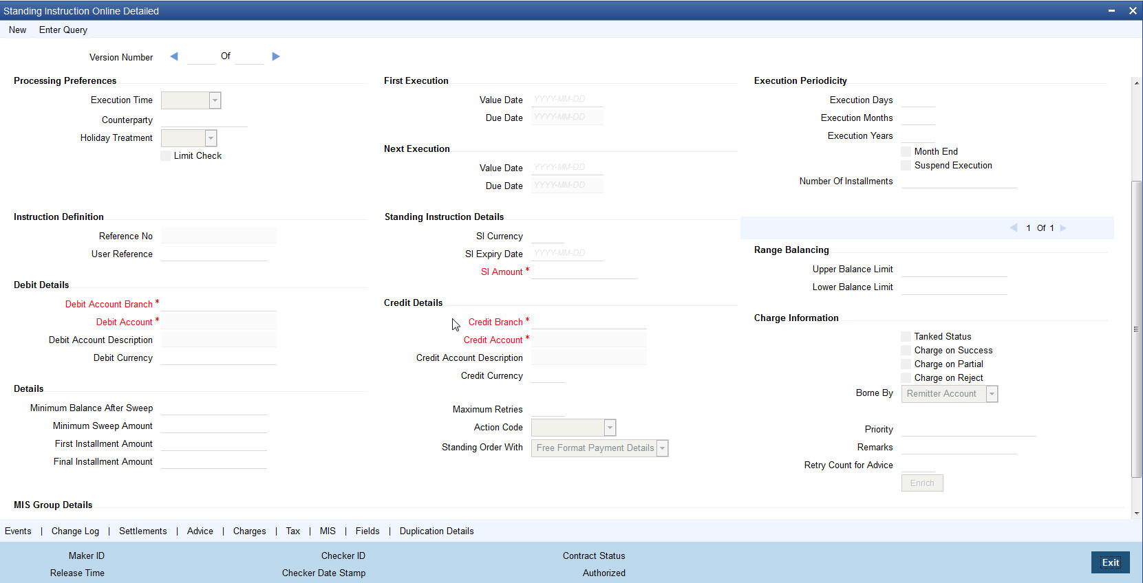 The details of an instruction are recorded in the ‘Standing Instruction Online Detailed’ screen.