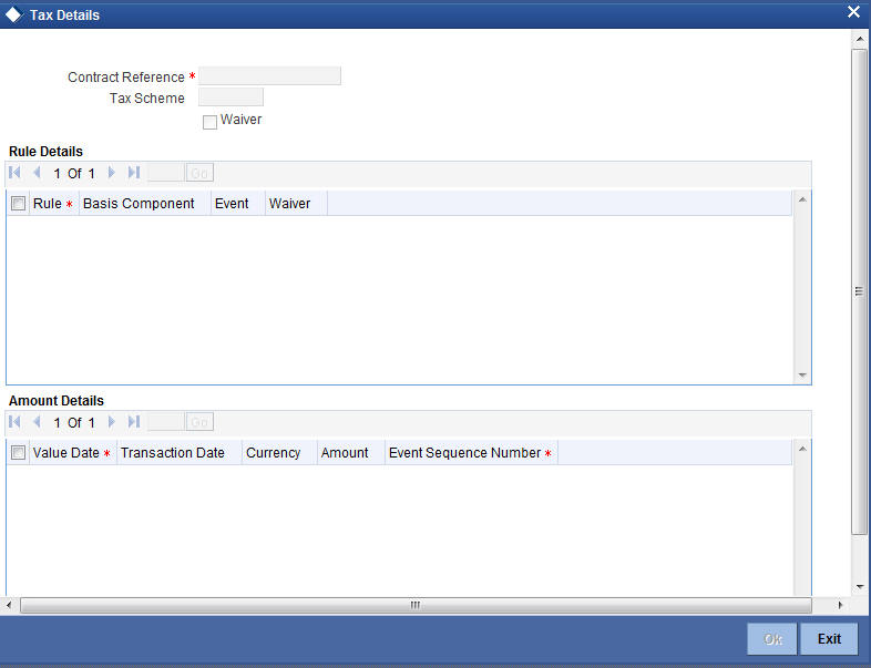 While processing an instruction, you can choose to waive the tax applicable. Click ‘Tax’ button. The ‘Tax Details’ screen will be displayed.