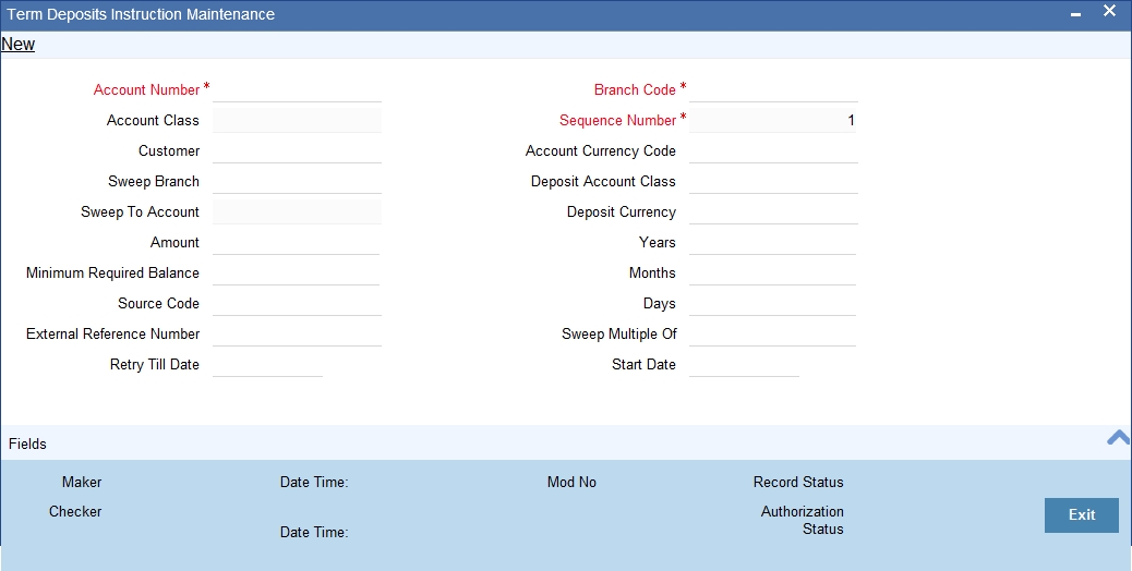 All User Defined Fields (UDFs) linked to the function ID ‘ICDINSMT’ are displayed in the ‘User Defined Fields’ screen. Invoke this screen by clicking ‘Fields’ button on the ‘Term Deposits Instruction Maintenance’ screen.
