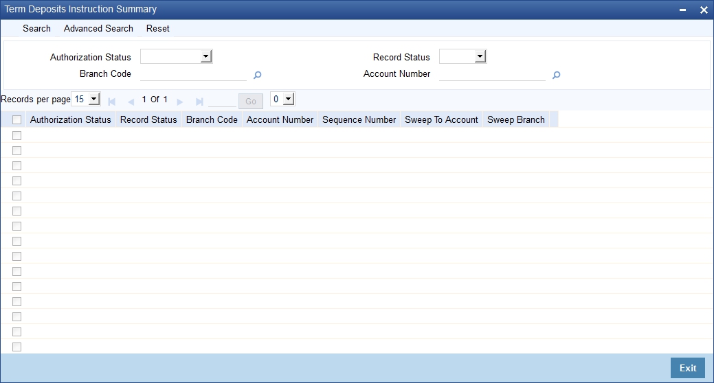 You can view summary of all instructions using the ‘Term Deposits Instruction Summary’ screen. To invoke this screen, type ‘ICSINSMT’ in the field at the top right corner of the Application tool bar and click the adjoining arrow button.