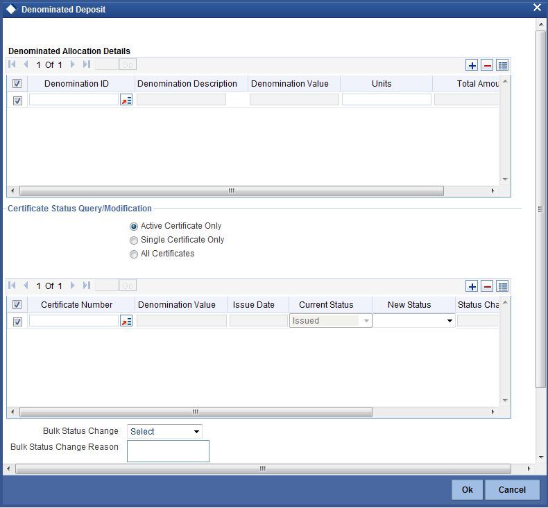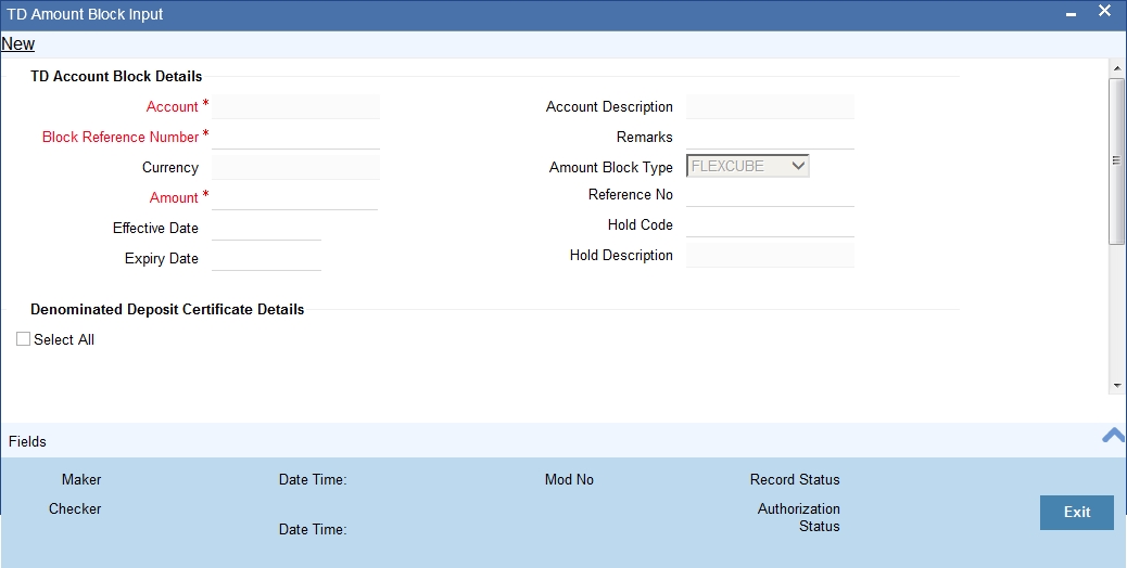 Amount blocking of a denominated certificates can be done using ‘TD Amount Block Input’ screen. In case of manual TD amount block, you can designate the denominated certificates supporting the block. Once a certificate is designated for block, the status of the certificate will be modified to 'Amount Blocked' from issued, re-denominated, rollover issue or duplicate status automatically.