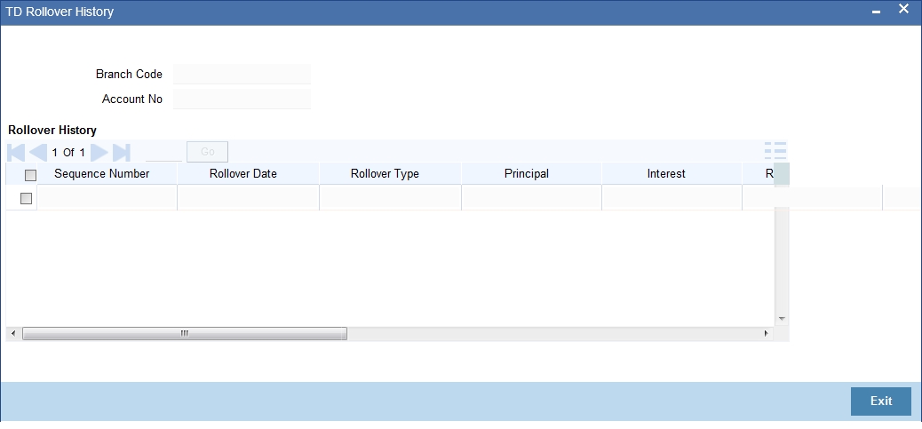 Specify the account number/ GL from which the fund is transferred to TD account on rollover. This field will return the branch code if the account is selected and NULL will be returned if GL is selected. If pay-out mode is GL then the system displays only GLs in the option list.