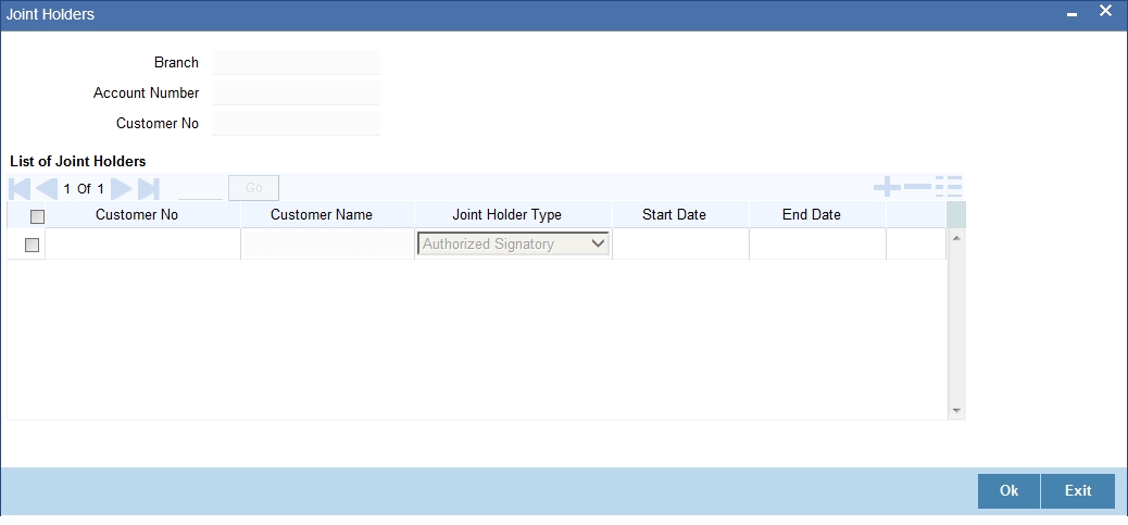 To view the joint holder’s details of an account and the mode of operation maintained at the account level, place the cursor on the Account field and press Ctrl+J. The system displays the ‘Joint Holder’ screen.