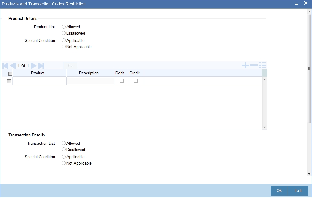 This invokes the ‘Products and Transaction Codes Restriction’ screen. |