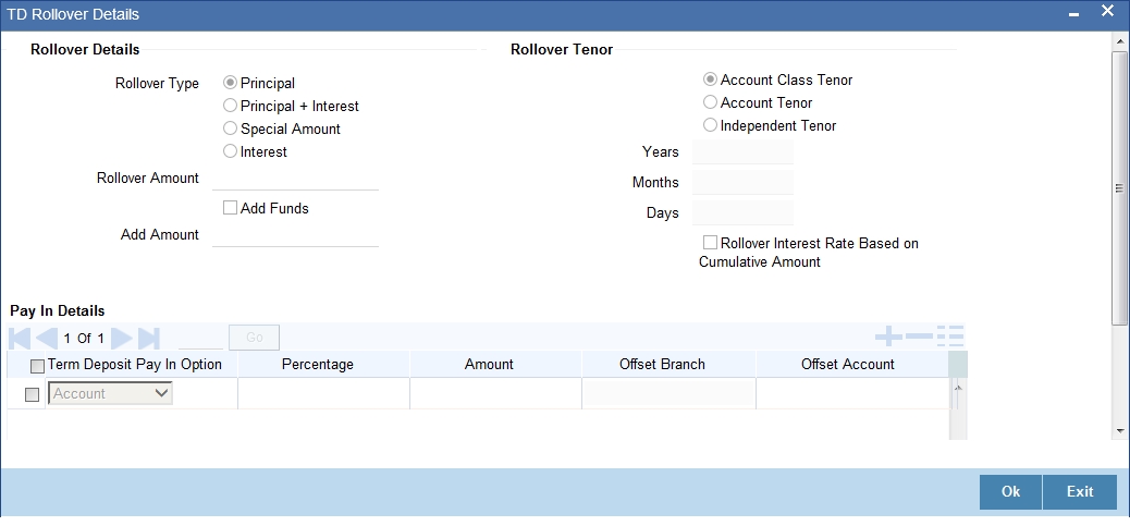 Select the Payin Details for debiting the additonal amount for rollover from the drop down list. The list displays the following values: