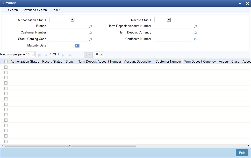 You can view a summary of all term deposit accounts in the system, using the ‘Deposit Account Summary’ screen.