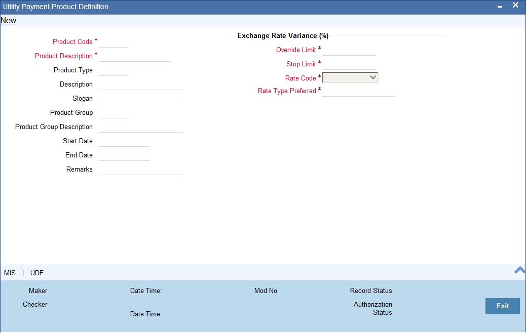 Click ‘MIS’ to specify any MIS details that would be applicable for any utility payment transactions involving the product.