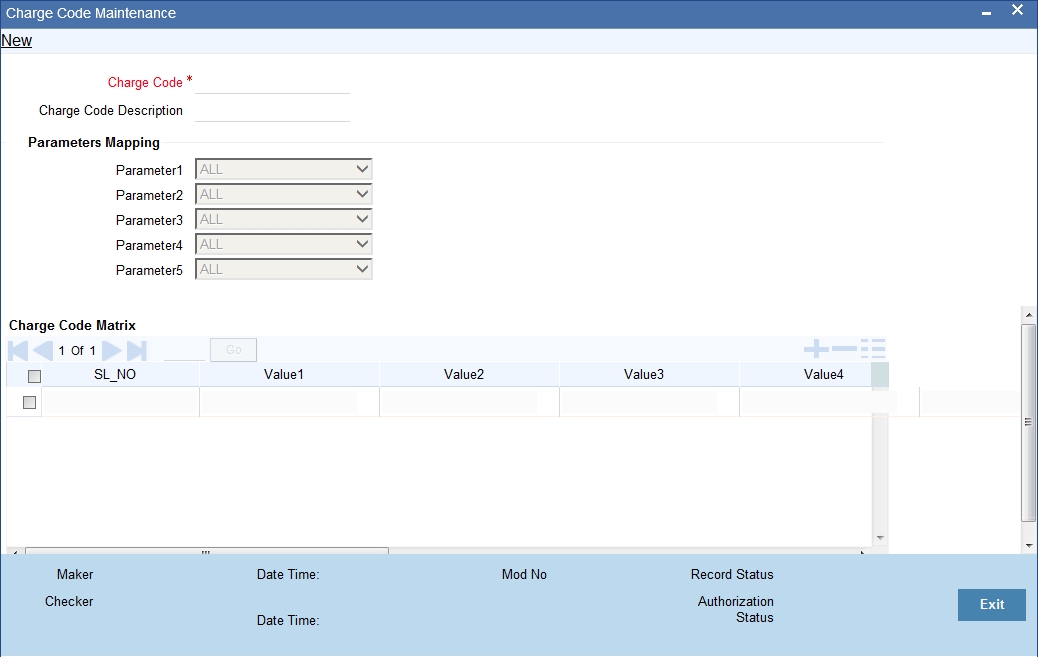 In the ‘Charge Code Maintenance’ screen, charges based on some additional parameters which are not a part of ‘ARC Maintenance’ can be maintained. These charge codes will help in differentiating inter-branch transactions and inter-bank charges. You can invoke this screen by typing ‘STDCHGCD’ in the field at the top right corner of the Application tool bar and clicking the adjoining arrow button.