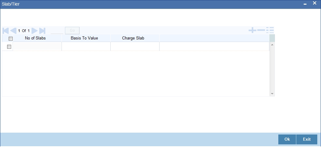 Select the Slab Type as Slab or Tier from the drop down list. If Slab Type is Slab or Tier, then provide the slab or tier details in the slab or tier sub-screen by clicking ‘S’ button.