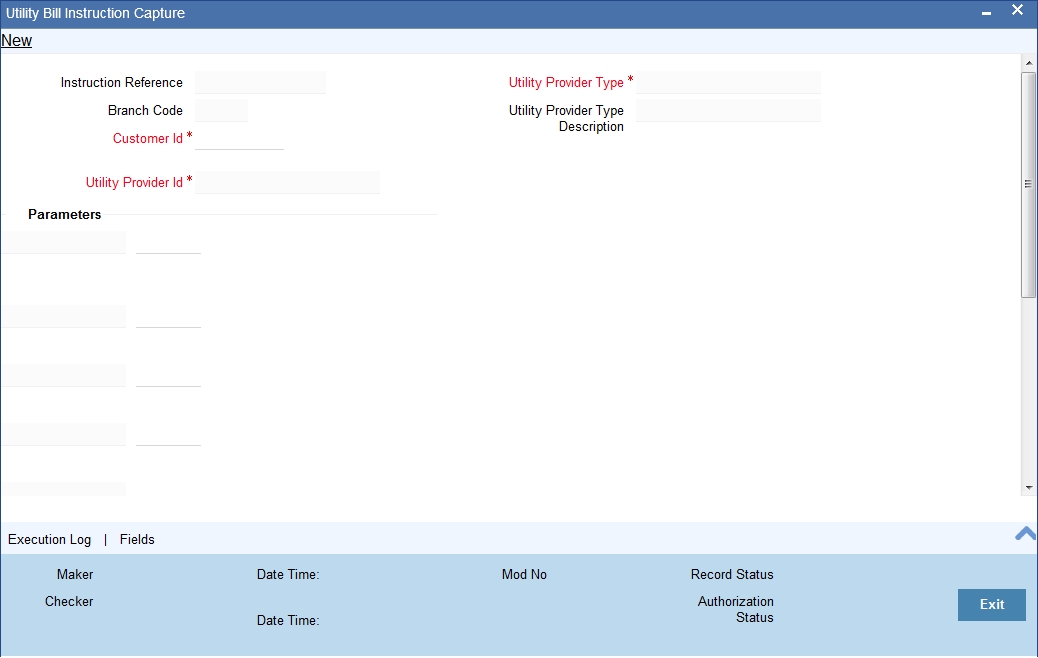 The system picks up all parameters maintained for the utility provider type and displays them here. You can specify values for each one of them.