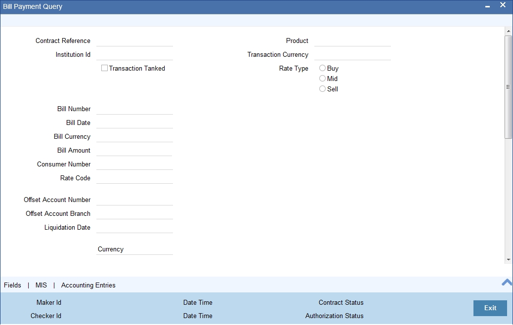 In Oracle FLEXCUBE, a bill payment transaction for a customer is entered into the system against a specific product that has been created for processing particular types of utility payments made by customers in favor of specific utility providers. For instance, electricity charges payment made by a customer to a specific electrical services provider is entered into the system against a product created specifically for the utility provider, for electricity charge bill payments.