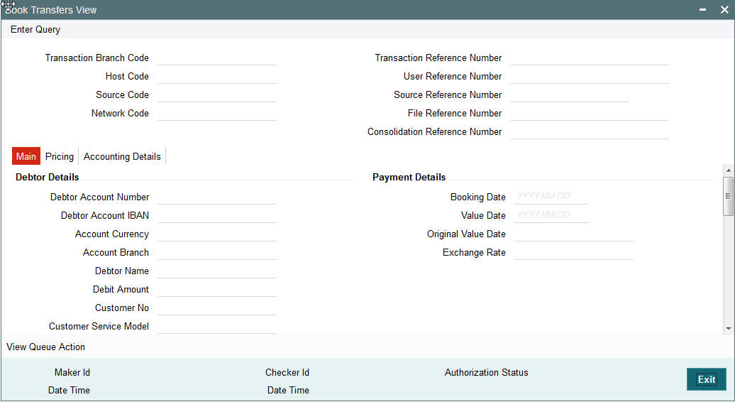 The system displays all the fields in the below mentioned tabs based on the transaction reference number selected.