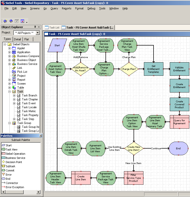 Siebel Business Process Framework: Task UI Guide > Overview of Siebel Task UI > About the Task EditorThe Task Editor is a graphical user interface in Siebel Tools that provides a declarative framework that helps you create a task UI. It allows you to use an object oriented programming language in an integrated development environment. You can select a step or connector from a palette and without releasing the selection, you can move different types of steps and connectors from a palette to a canvas. It minimizes scripting, allows for dynamic modification, and encourages you to use a hierarchical development strategy. The Task Editor is integrated with the Siebel Workflow Editor. It simplifies the work of supporting a business process that is complex and has a long life in a Siebel application. Example Task UI Flow in the Task EditorFigure 3 includes an example task UI flow that Siebel Tools displays in the Task Editor. Main Elements of the Task EditorFigure 4 includes the main elements of the Task Editor. Explanation of CalloutsThe Task Editor includes the following items: