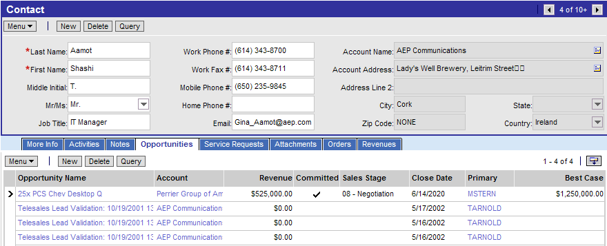 To implement a view that displays a many-to-one relationship between contacts and an opportunity, where many contact child records are related to one parent opportunity, a view references the Opportunity business object. To view this relationship in the Siebel client, navigate to the Opportunities List, drill down on the Opportunity Name field, and then click the Contacts tab. |