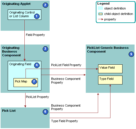 - Originating field. Field in the originating business component that the originating control represents. This field typically contains one pick map child that defines how the field from the PickList Generic business component maps to the originating business component. In this example, Quality is the originating field.